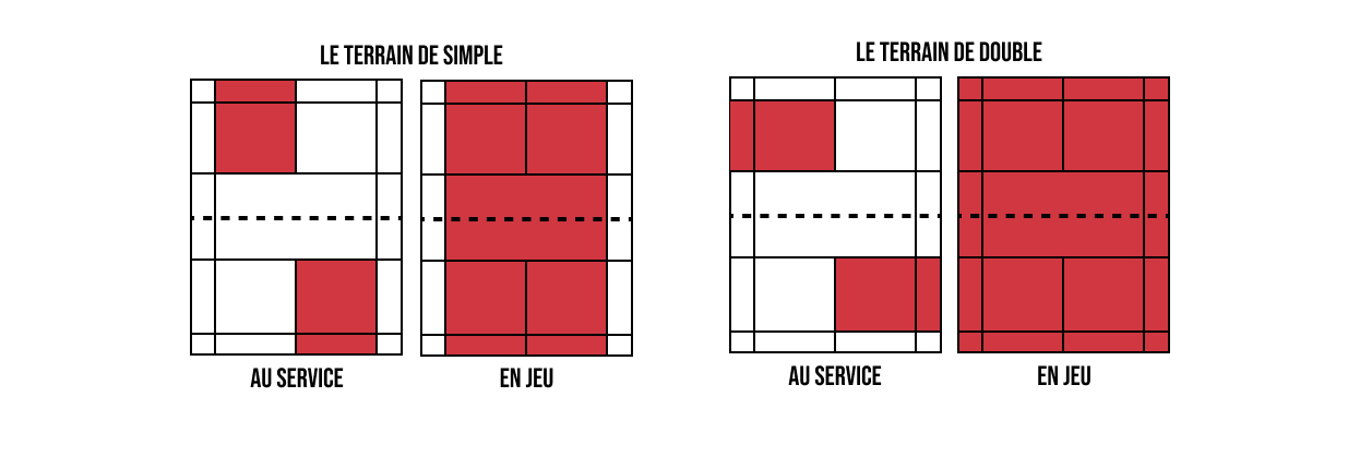 En simple, chaque joueur/joueuse occupe tout le terrain de son côté. Au début du set, ainsi qu’à chaque fois que le score du serveur est pair, le service s’effectue depuis la zone de droite. Si le score de la personnes qui sert est impair, il/elle doit alors servir depuis la zone de gauche. Le/la joueur/joueuse qui sert doit envoyer le volant dans la zone de service opposée en diagonale. Si la personne qui sert remporte l’échange, il/elle marque un point et continue de servir, mais en alternant la zone de service. En revanche, si la personne qui reçoit remporte l’échange, il/elle marque un point et prend à son tour le service, en respectant la même règle de position en fonction du score (pair à droite, impair à gauche). Cette alternance des zones de service en fonction du score est essentielle pour assurer un équilibre et un rythme dans le jeu.