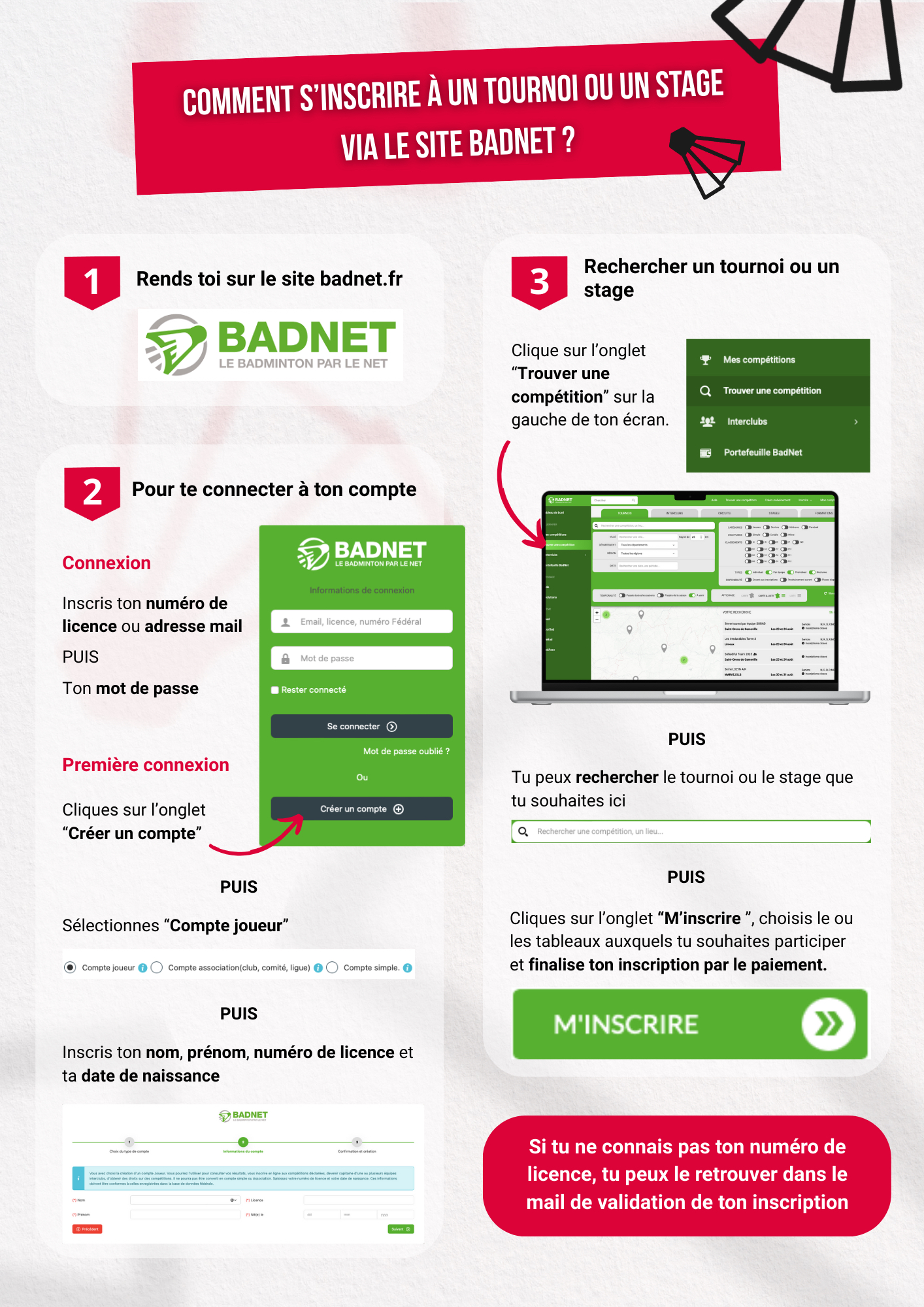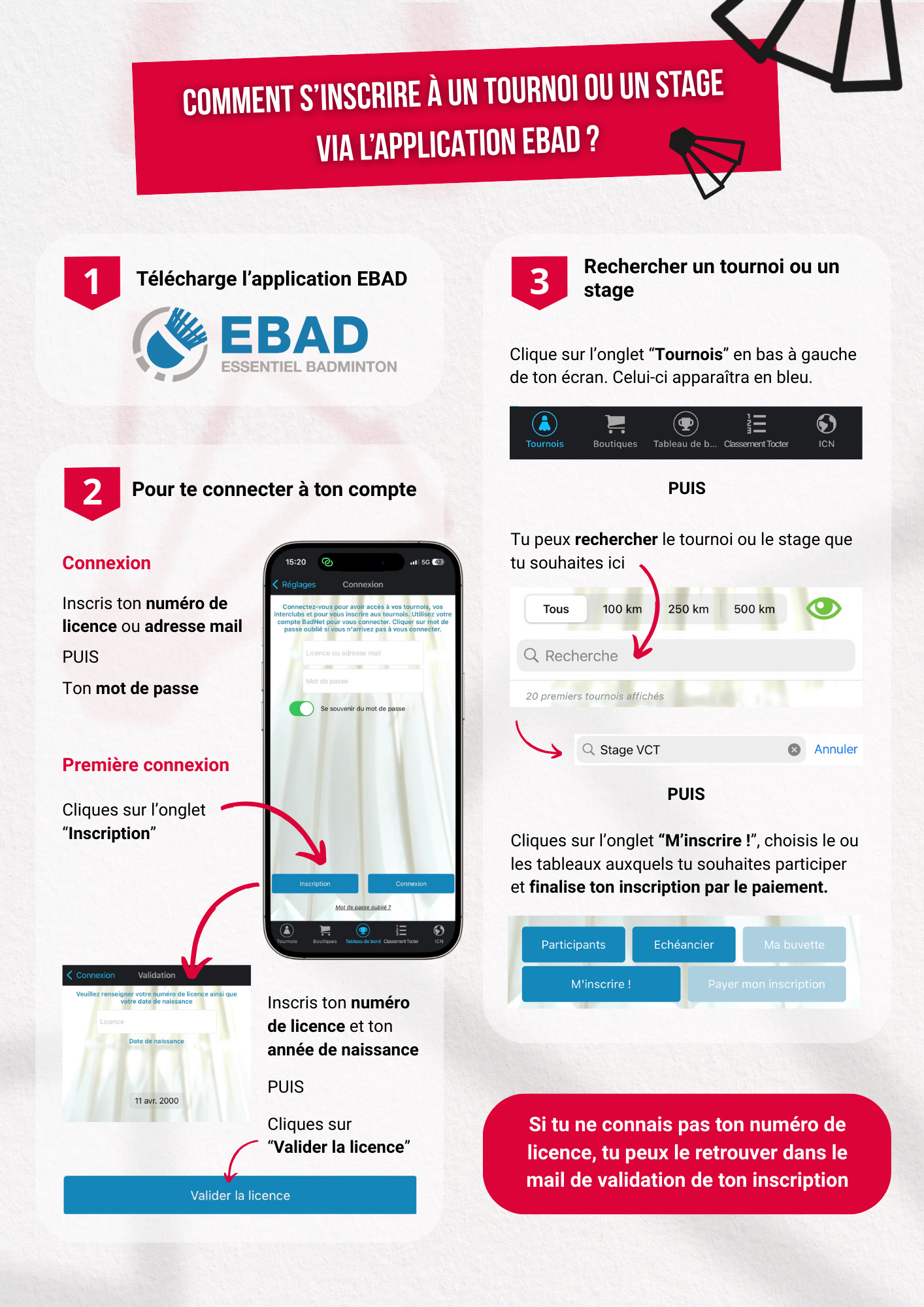 Les inscriptions se font sur https://badnet.fr/ ou via l’application Ebad pour toutes les compétitions. Il faut d’abord créer ton compte avec ton numéro de licence trouvable sur myffbad.fr pour pouvoir faire ton inscription. Tu verras apparaître toutes les compétitions organisées. Tu devras choisir le tournoi qui t'intéresse et t’inscrire.